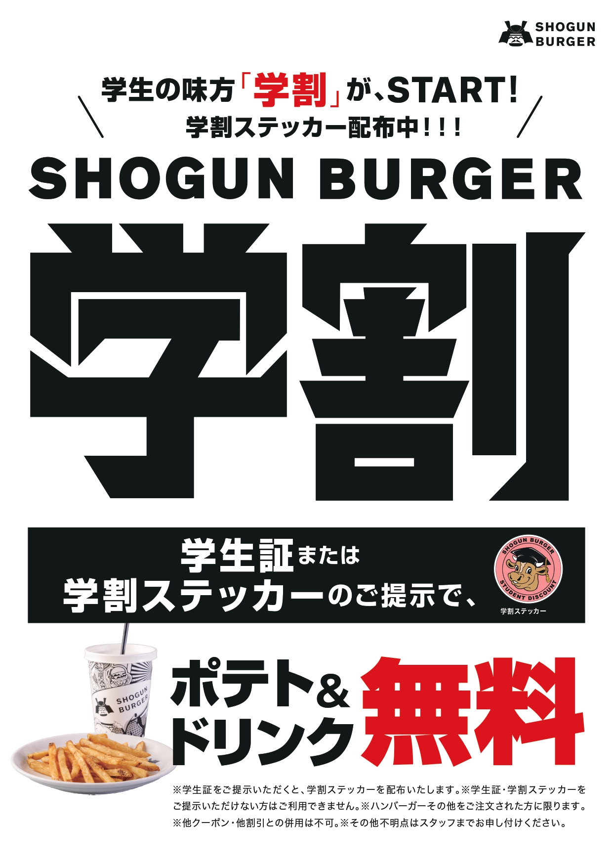 さらに、町田店では「学割キャンペーン」もスタート。学生証または学割ステッカーの提示で、ポテト&ソフトドリンクが無料といううれしいサービスです。学生の方は学生証をお忘れなく!
