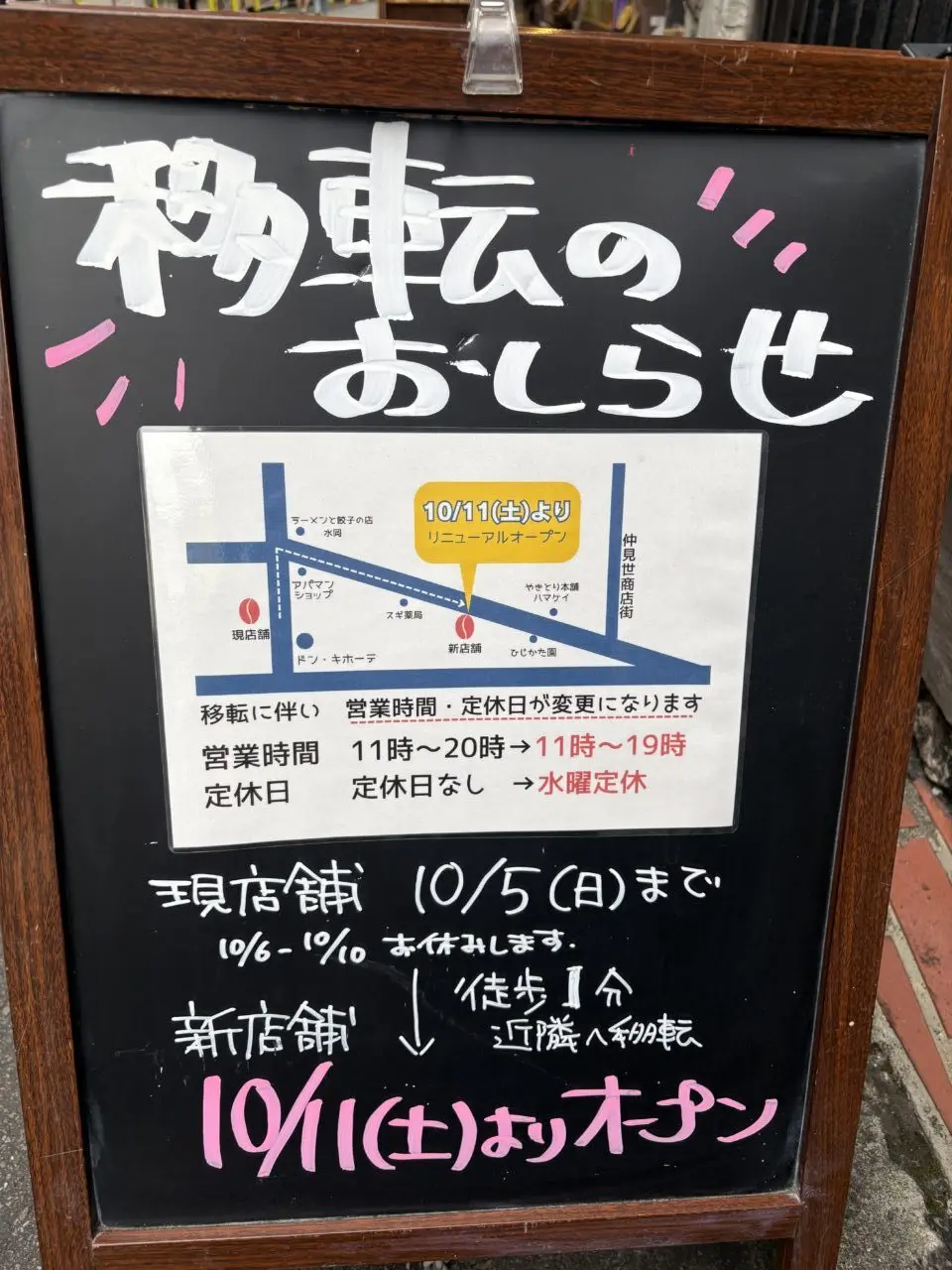 現店舗から徒歩約1分のターミナルロード商店街に移転となるため、10月6日(月)~10日(金)までは休業となります。