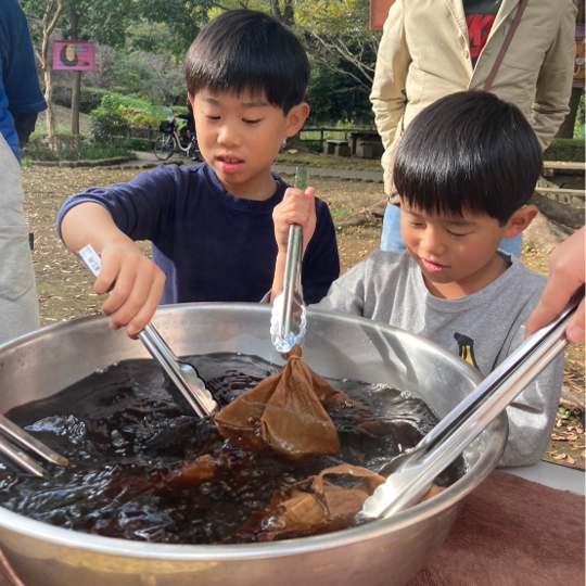 染め物体験ワークショップです。芹ヶ谷公園のどんぐりや桜の葉を染料として、エコバッグや巾着袋を染めます。