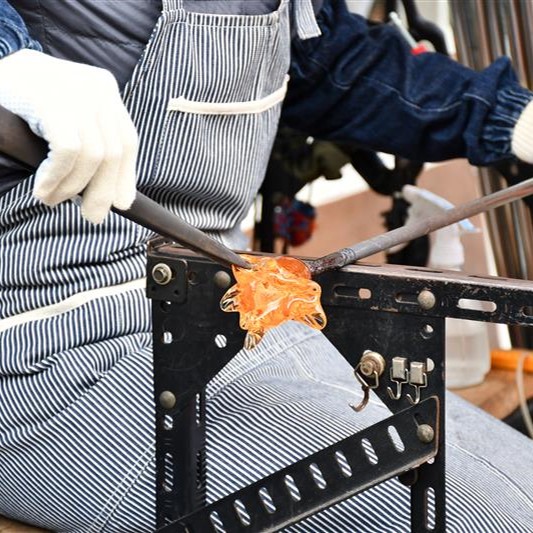 熔けたガラスを引っ張る、伸ばす、つつく、切るなどして遊びます。遊んで作った作品は、約2週間後にお届け予定です。