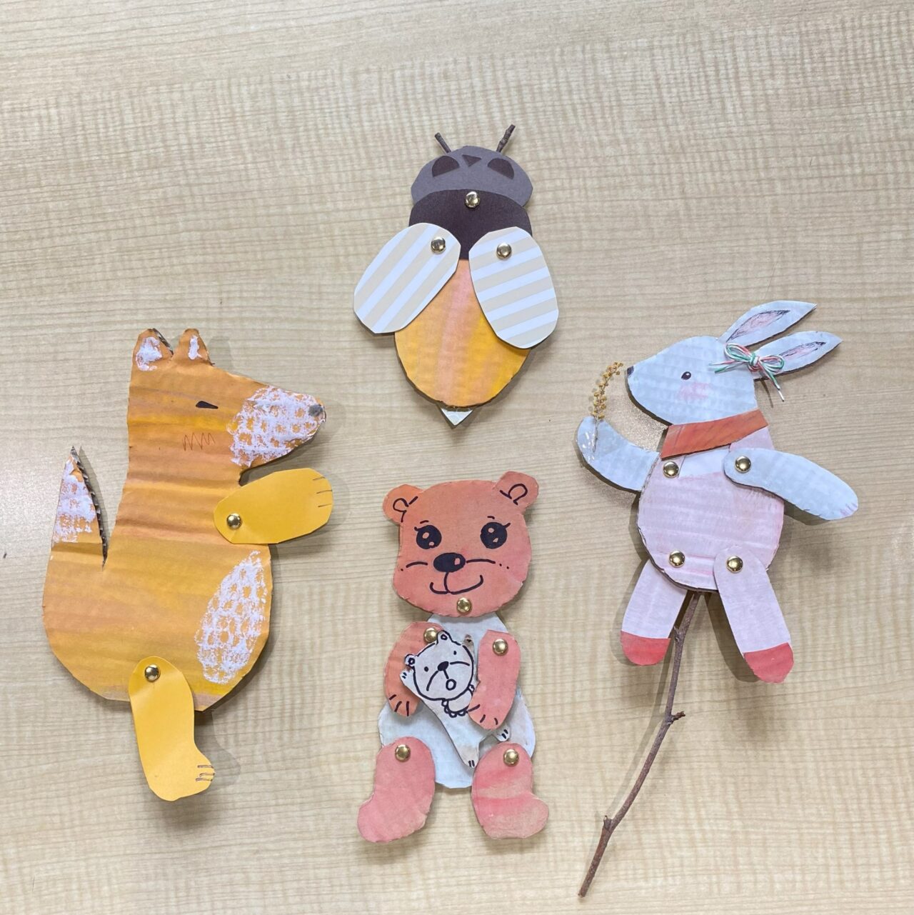 パーツを連結して動かすことのできる「割りピン」という材料を使って動くどうぶつを作ります。手足が動くウサギやゾウ、くねくね曲がるヘビなど自由な発想で楽しく工作できます。