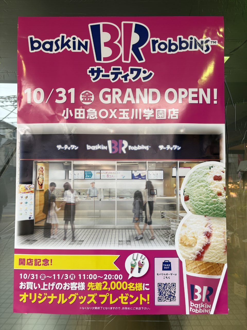 2025年10月31日(金)小田急線玉川学園前駅南口に、「サーティワンアイスクリーム」がオープン予定です!