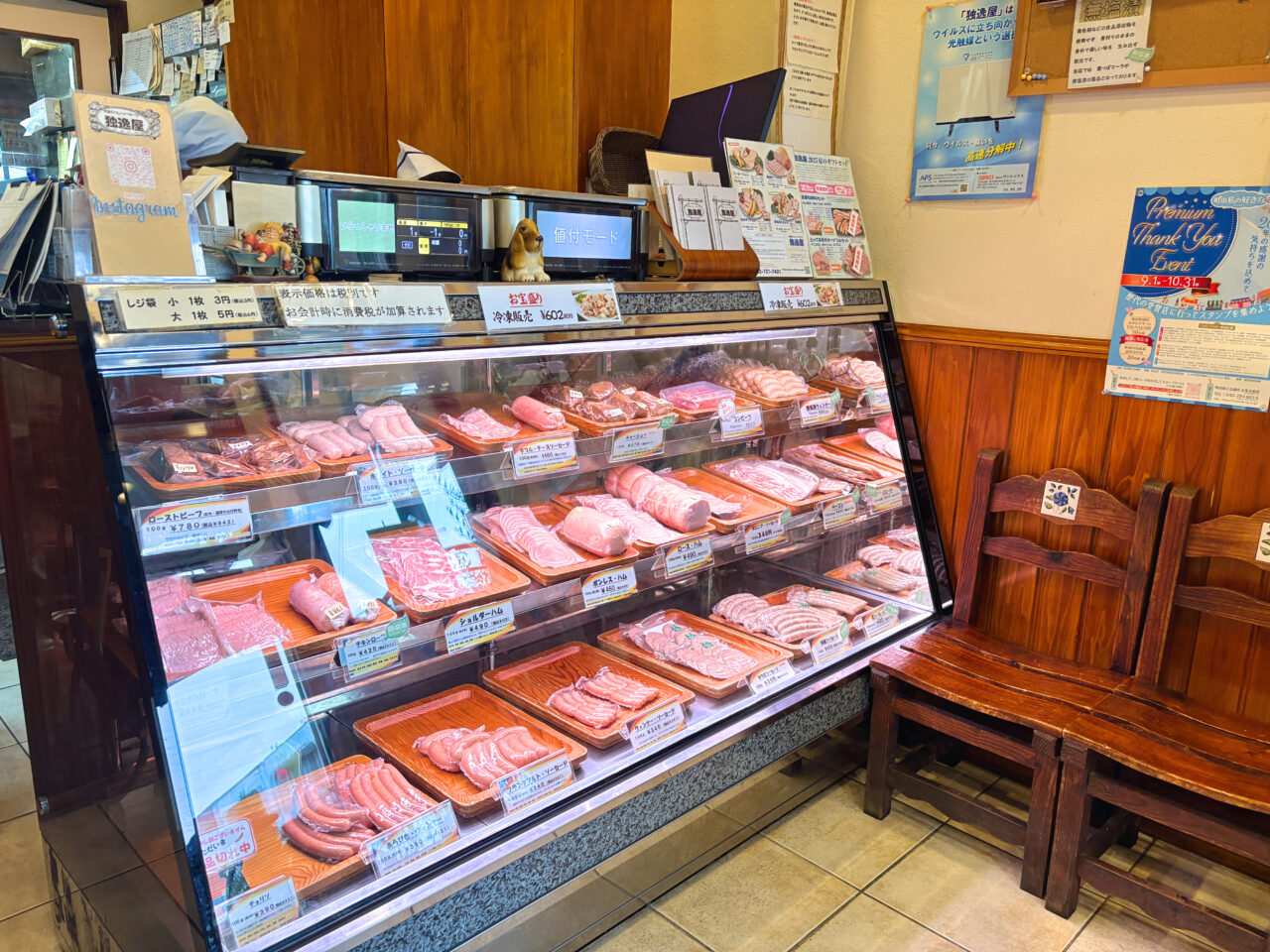 店内に足を踏み入れると、ガラスケースにずらりと並ぶソーセージやハム、ベーコンが目に入ります。お店の奥で丁寧に手造りされており、化学調味料、増量剤や保存料を使用せず、添加物も最小限に抑えて肉本来の旨みを引き出す製法が特徴です。