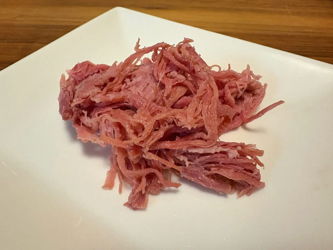 焼肉店でも使用する牛肉を約1週間塩漬けにし、圧力釜でじっくり煮て脂を取り除いたあと、手作業でほぐすという手間のかかった一品です。