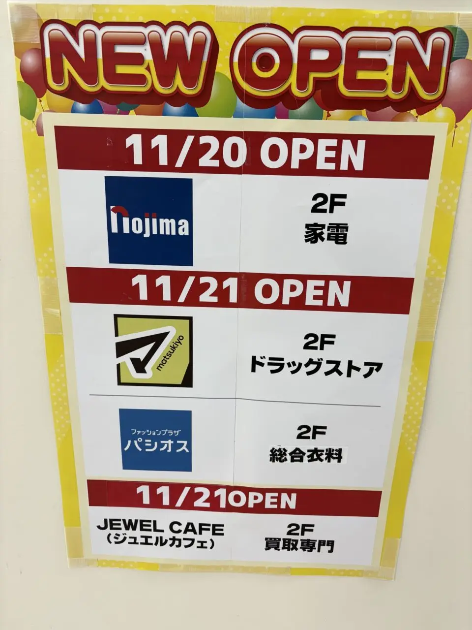 さらに、三和小川店では翌日の11月21日(金)に「マツモトキヨシ」「パシオス」「JEWEL CAFE」も続けてオープン予定。2階フロアが一気にリニューアルします。