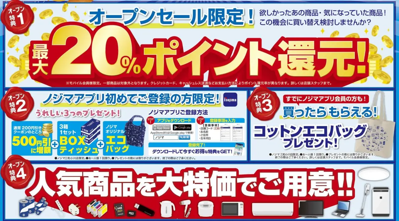 店舗は三和の2階フロアに出店。11月20日(木)~12月12日(金)の期間、オープン限定特価としてノジマポイントが20%還元になるお得なセールが開催予定です。