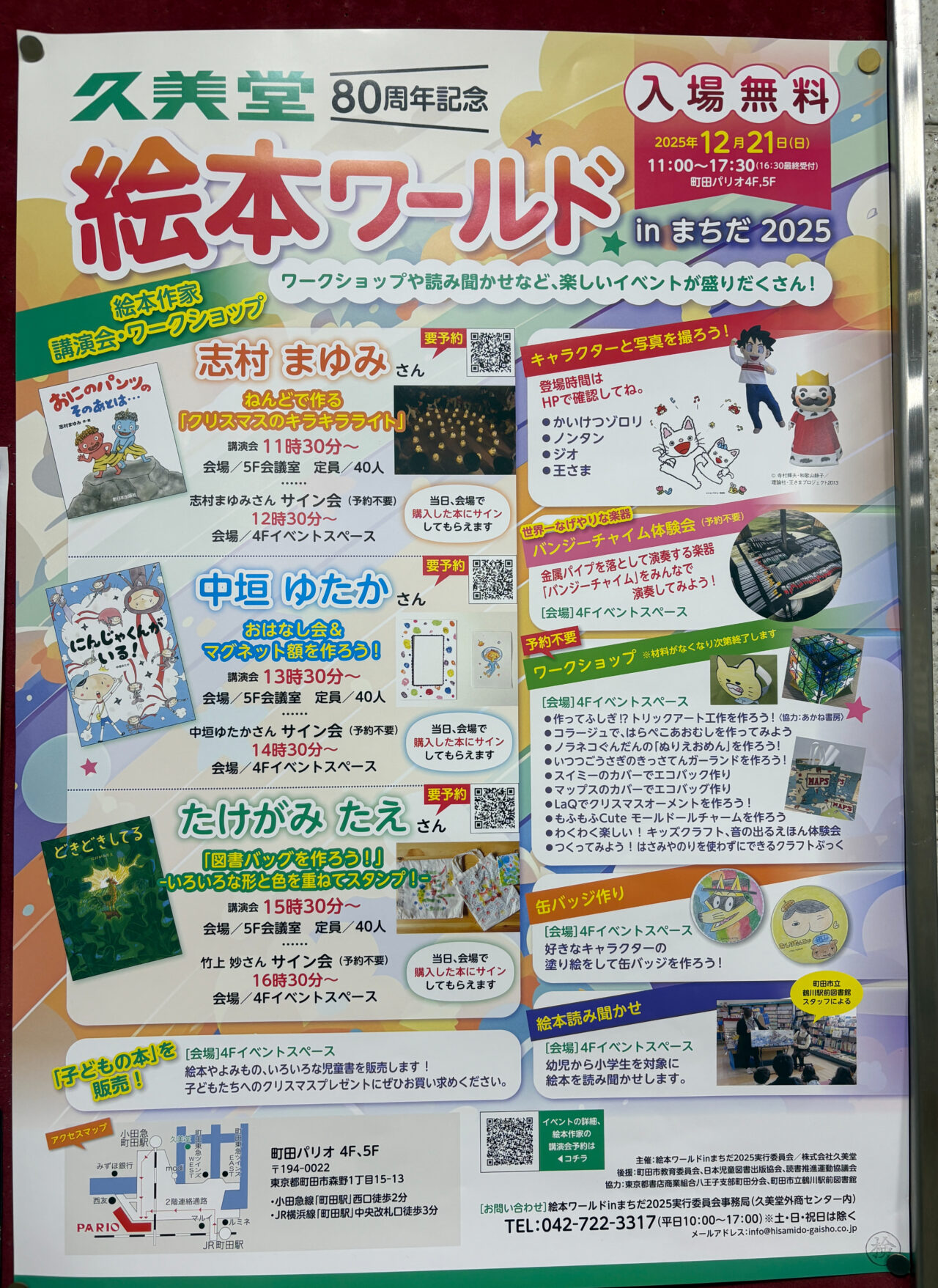 2025年12月21日(日)、久美堂80周年を記念した「絵本ワールド in まちだ 2025」が開催されます。絵本作家さんによる講演会やサイン会、親子で楽しめるワークショップが盛りだくさんなイベントです!