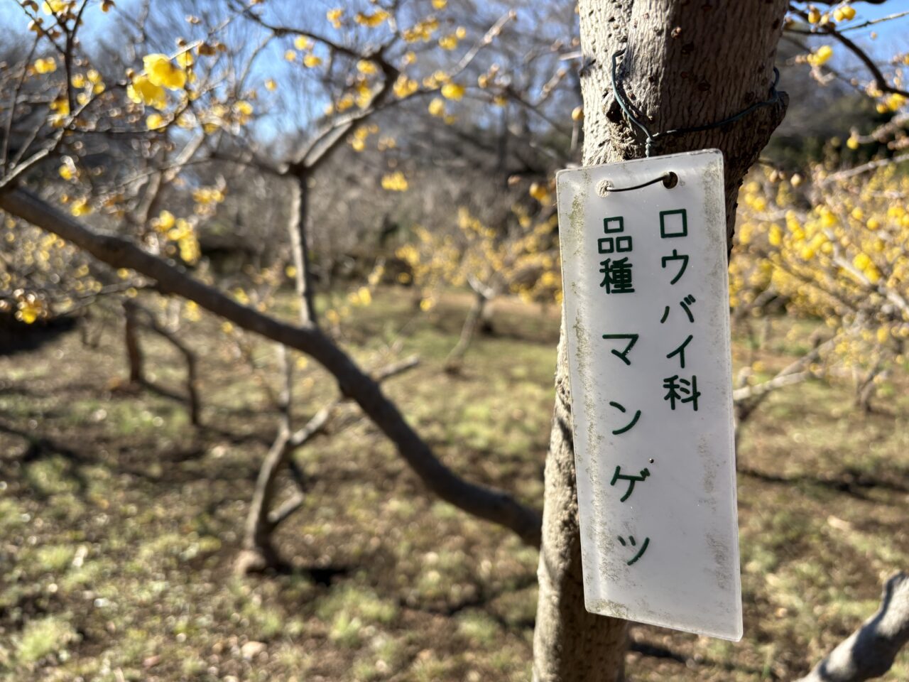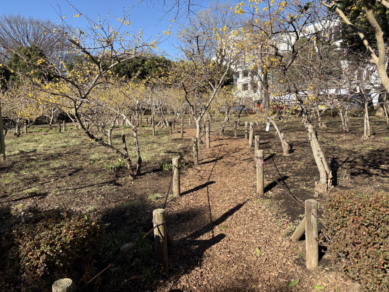 「蝋梅苑(ロウバイエン)」は、公園の駐車場のすぐそば。近くに寄ると、甘い花の香りが漂ってきます。
