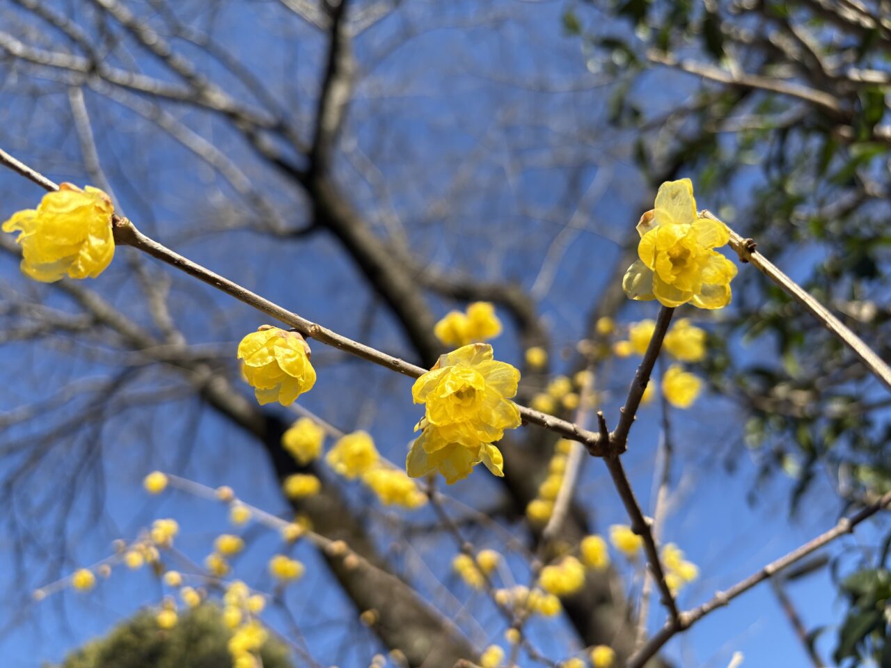 黄色い花が青空に映えて美しいです! マンゲツロウバイは12月に開花し、1月にかけて見ごろを迎えるため、これからの時期もまだまだ楽しめそうです。