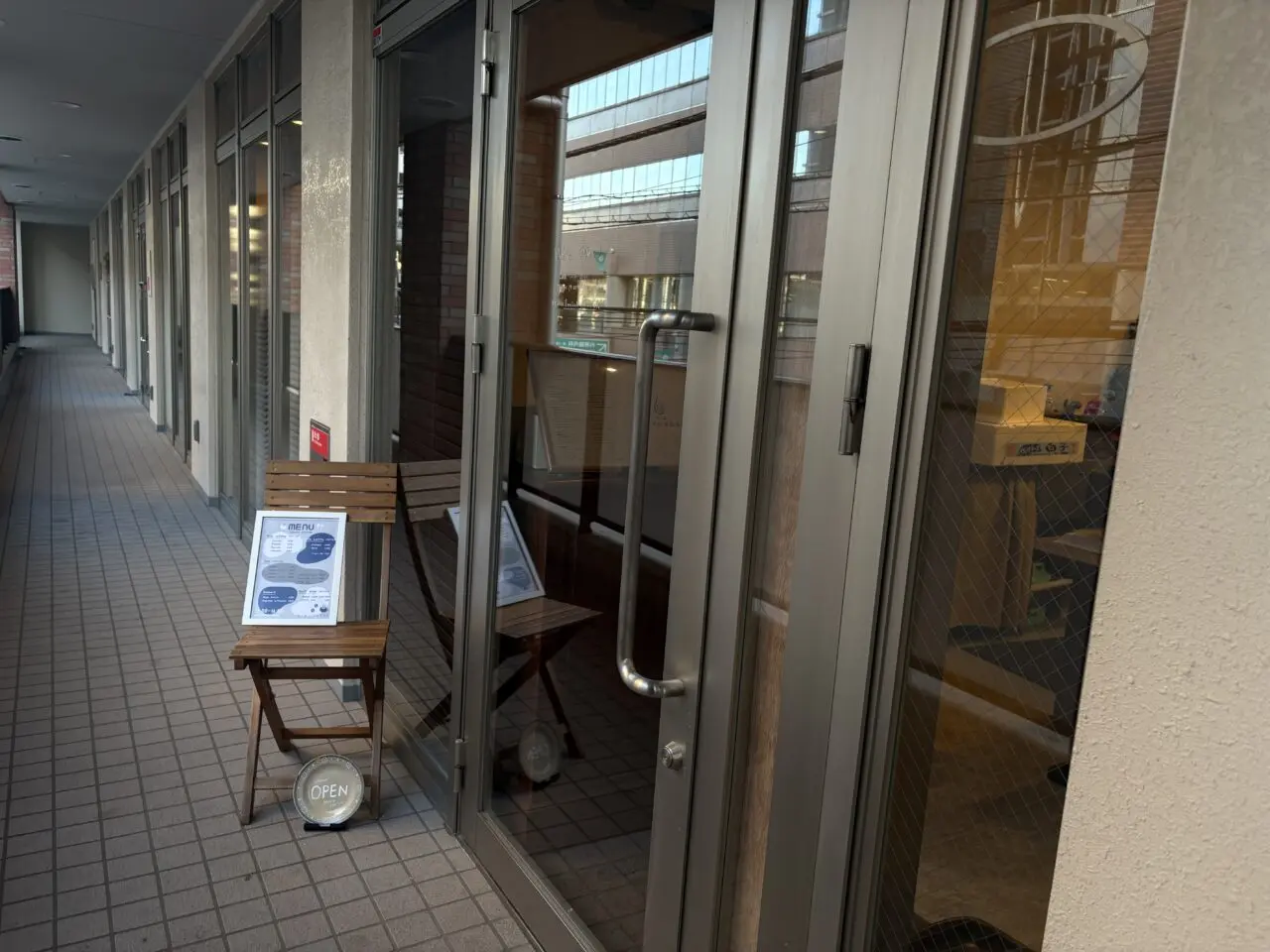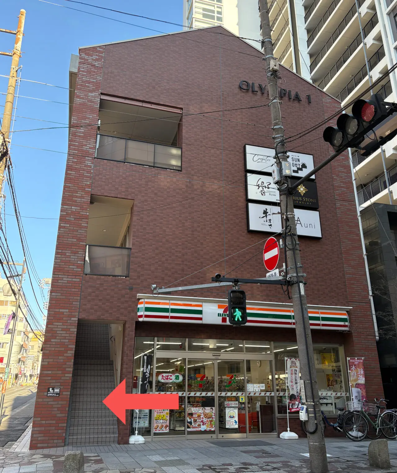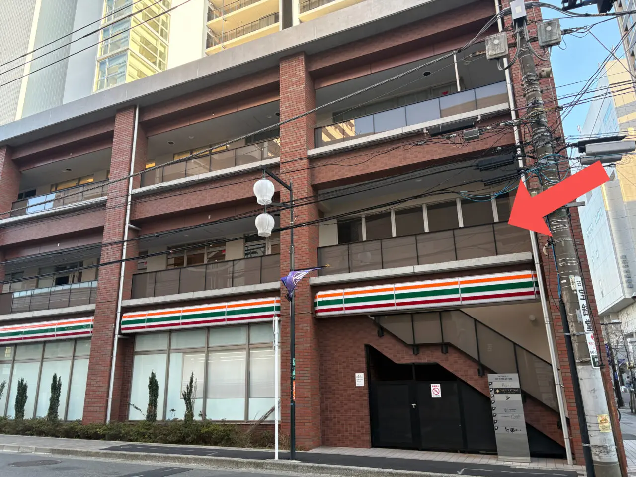店舗入り口へは、セブンイレブン側にある階段を上り、2階へと進みます。2026年1月中旬の取材時点では、店名が書かれた看板などは設置されていませんでした。
