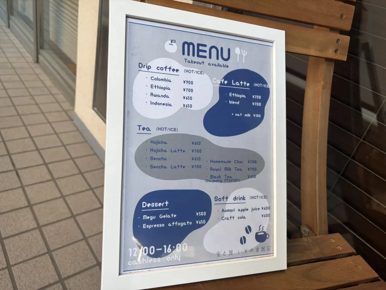 カフェタイムは、コーヒーやカフェラテ、ほうじ茶、自家製チャイなどのドリンクに加え、ジェラートも提供されています。ドリンクはテイクアウトも可能だそうです。