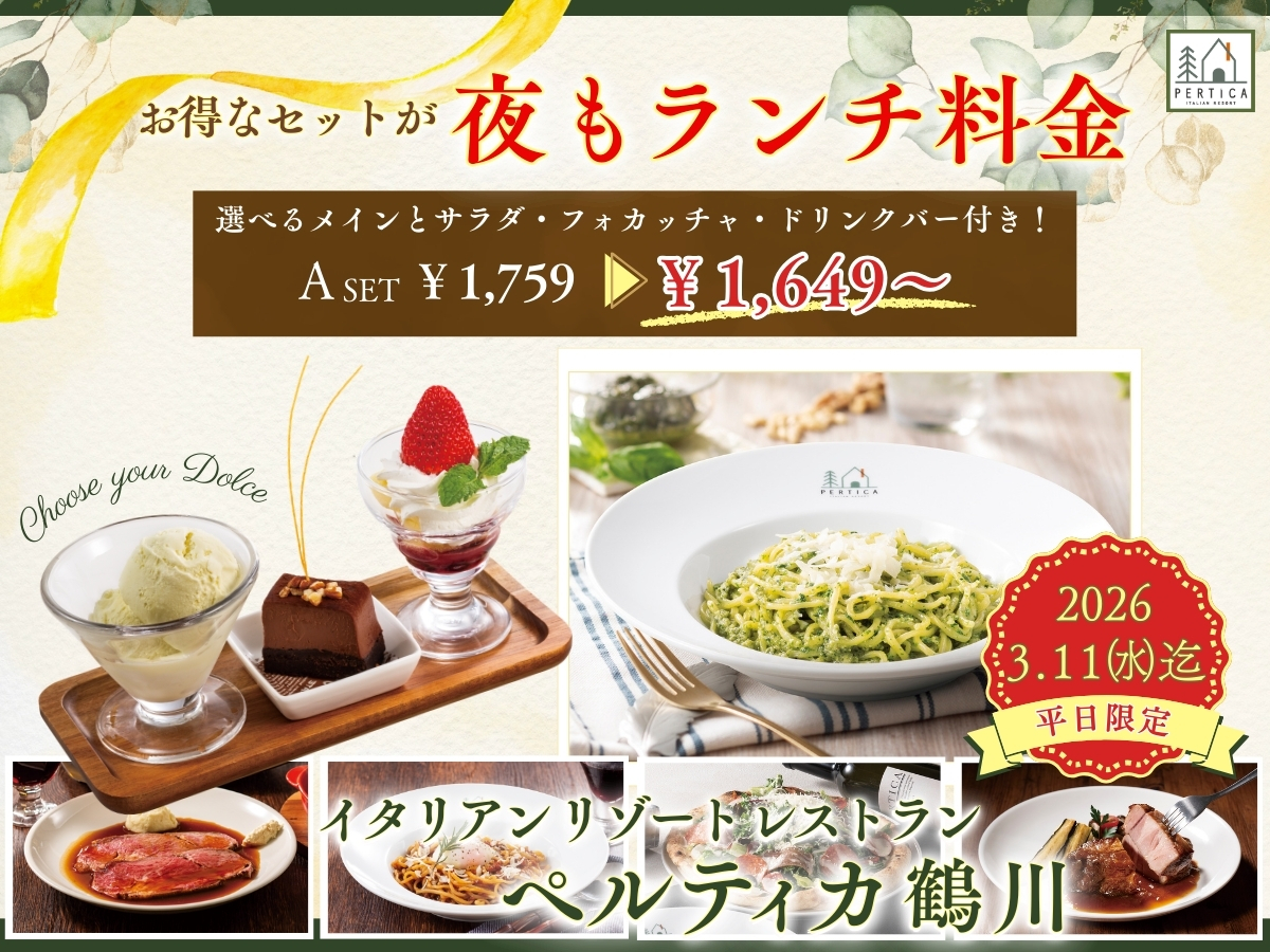 【町田市】2/26~期間限定!「イタリアン リゾート ペルティカ 鶴川」で、「夜もランチ料金キャンペーン」開催