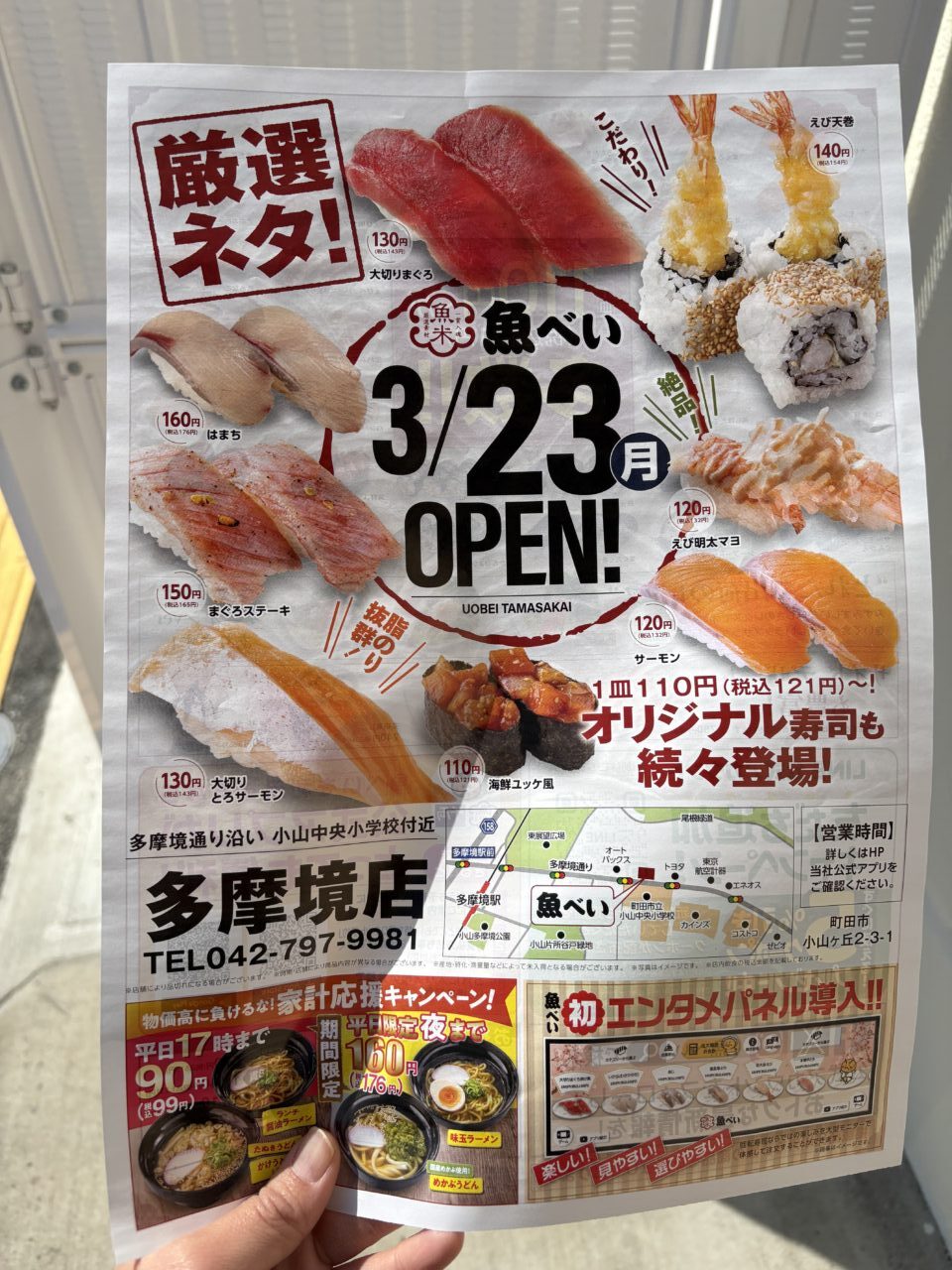 2026年3月23日(月)、多摩境通りに「魚べい 多摩境店」がオープン予定です。