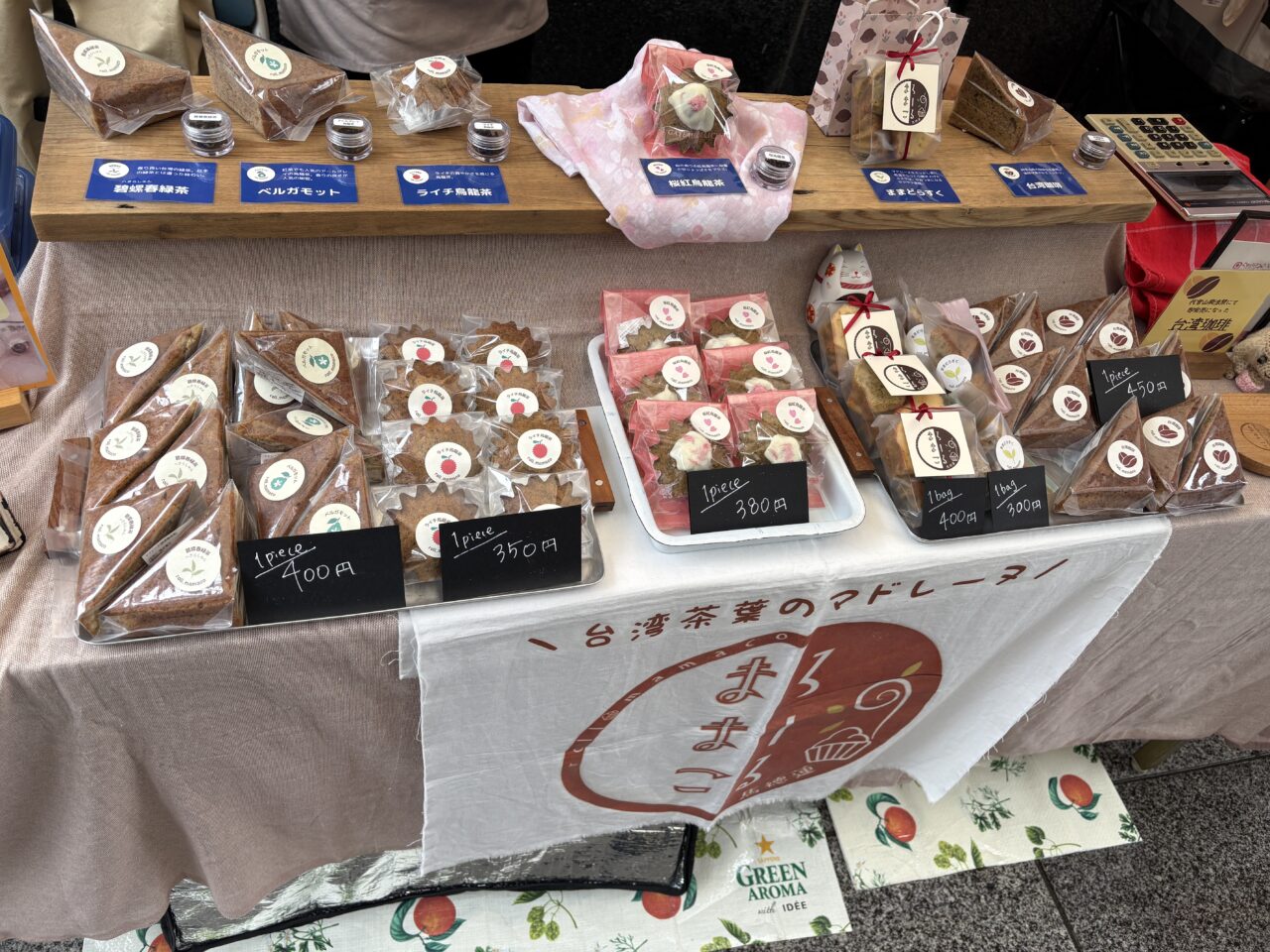 マルシェには、焼き菓子やパン、やきいも、ハンドメイド雑貨、カイロプラクティックなどの出店があり、グルメから体験系まで幅広く楽しめます。