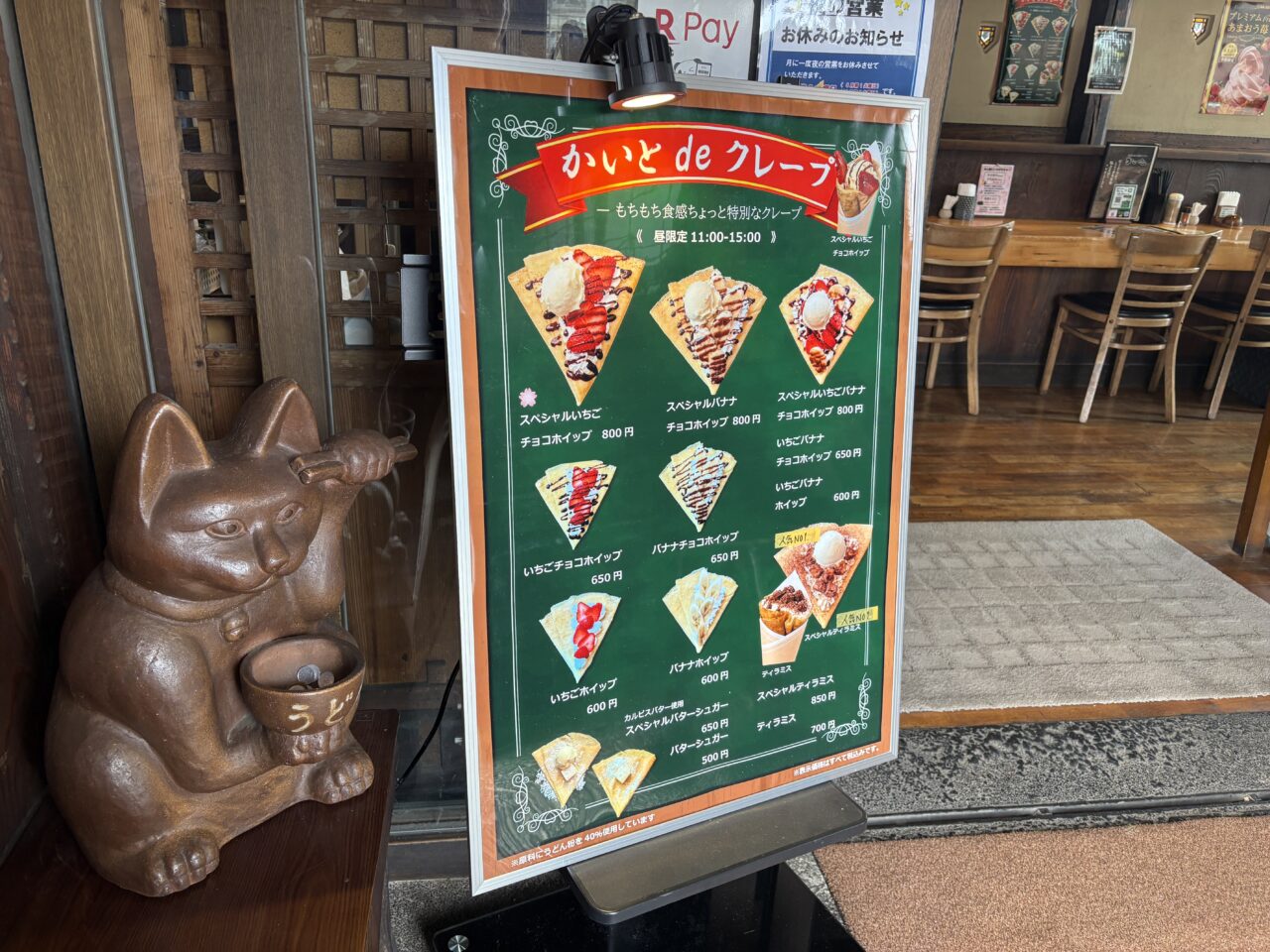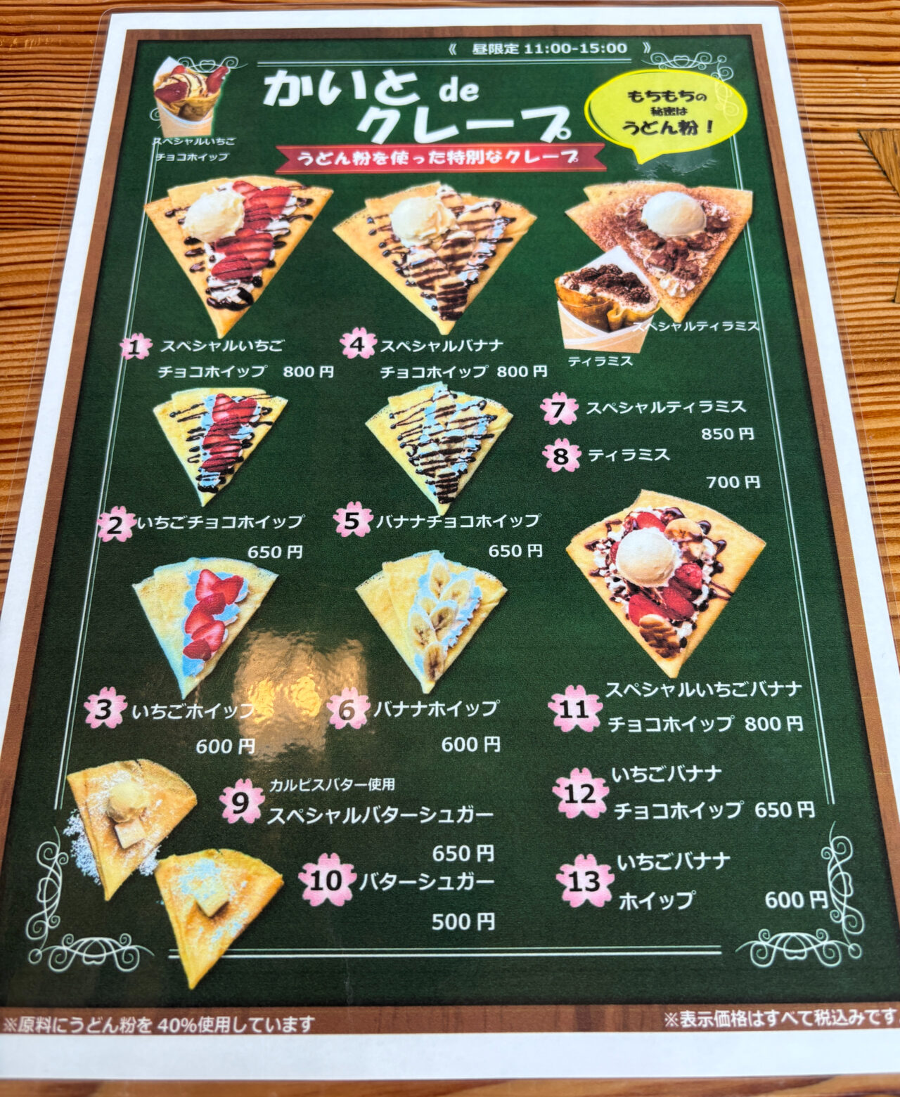 入店すると、さっそくクレープのメニューがありました。うどん店ですが、クレープのみの利用も可能で、テイクアウトにも対応しているそうです。
