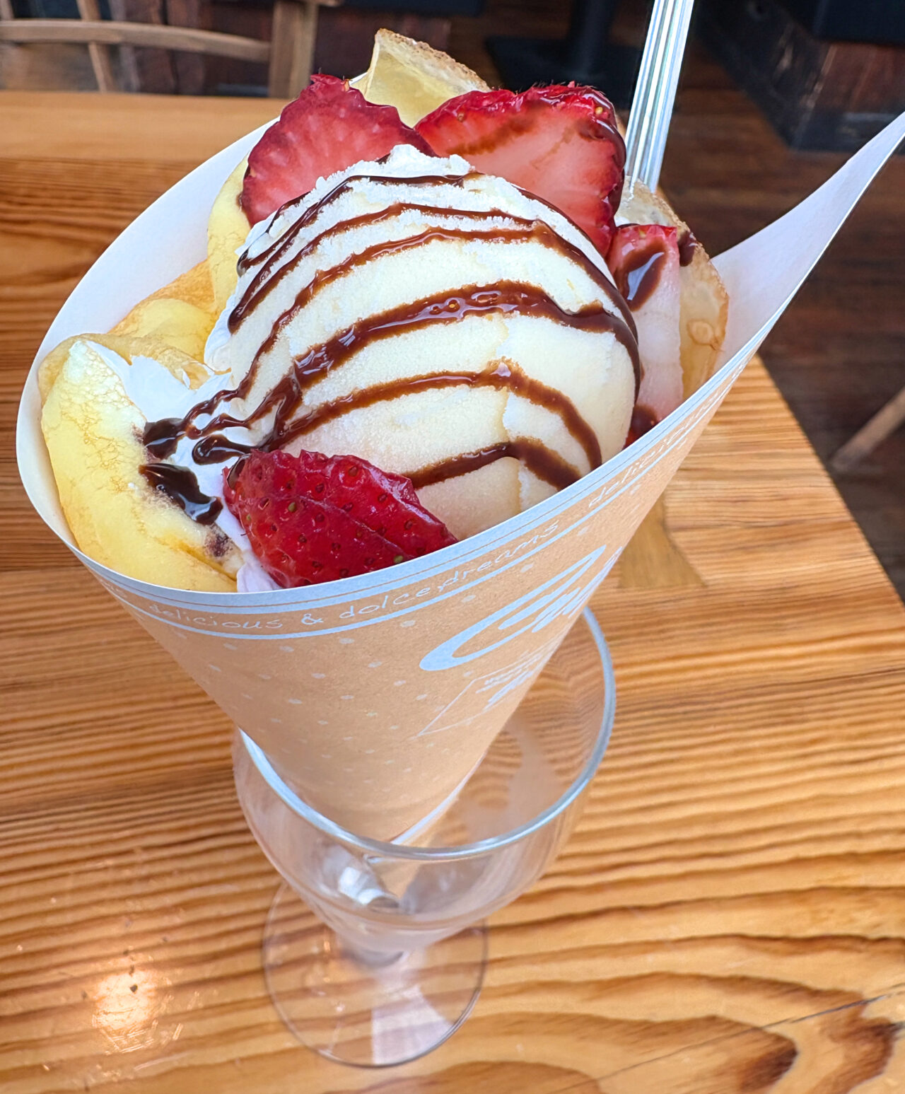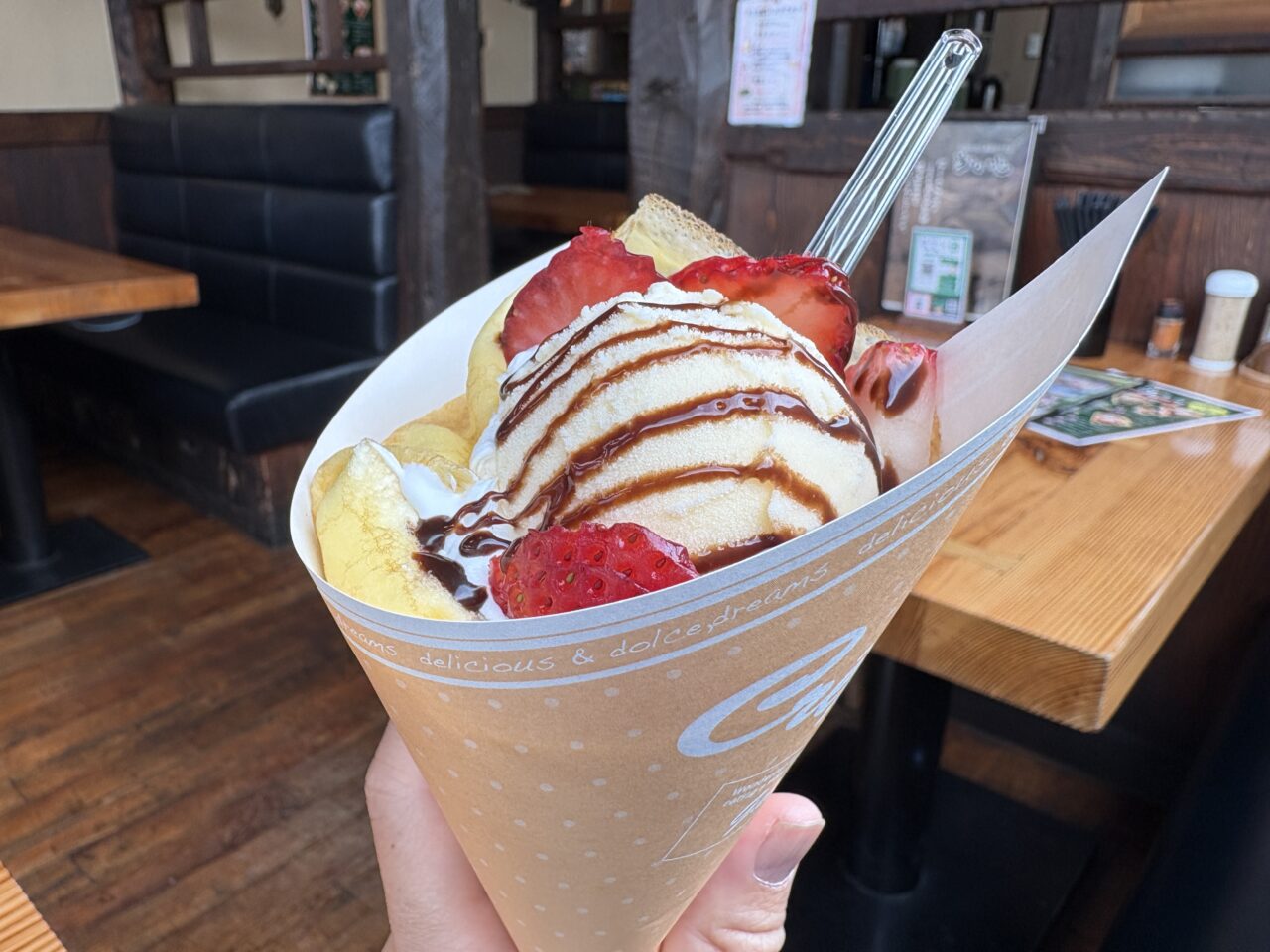 原料にうどん粉を40%使用しているそうで、もちもちの生地が特徴です。甘さ控えめな生地なので、ホイップやアイスの甘さとのバランスも絶妙です。生地そのもののおいしさを感じられるクレープでした。
